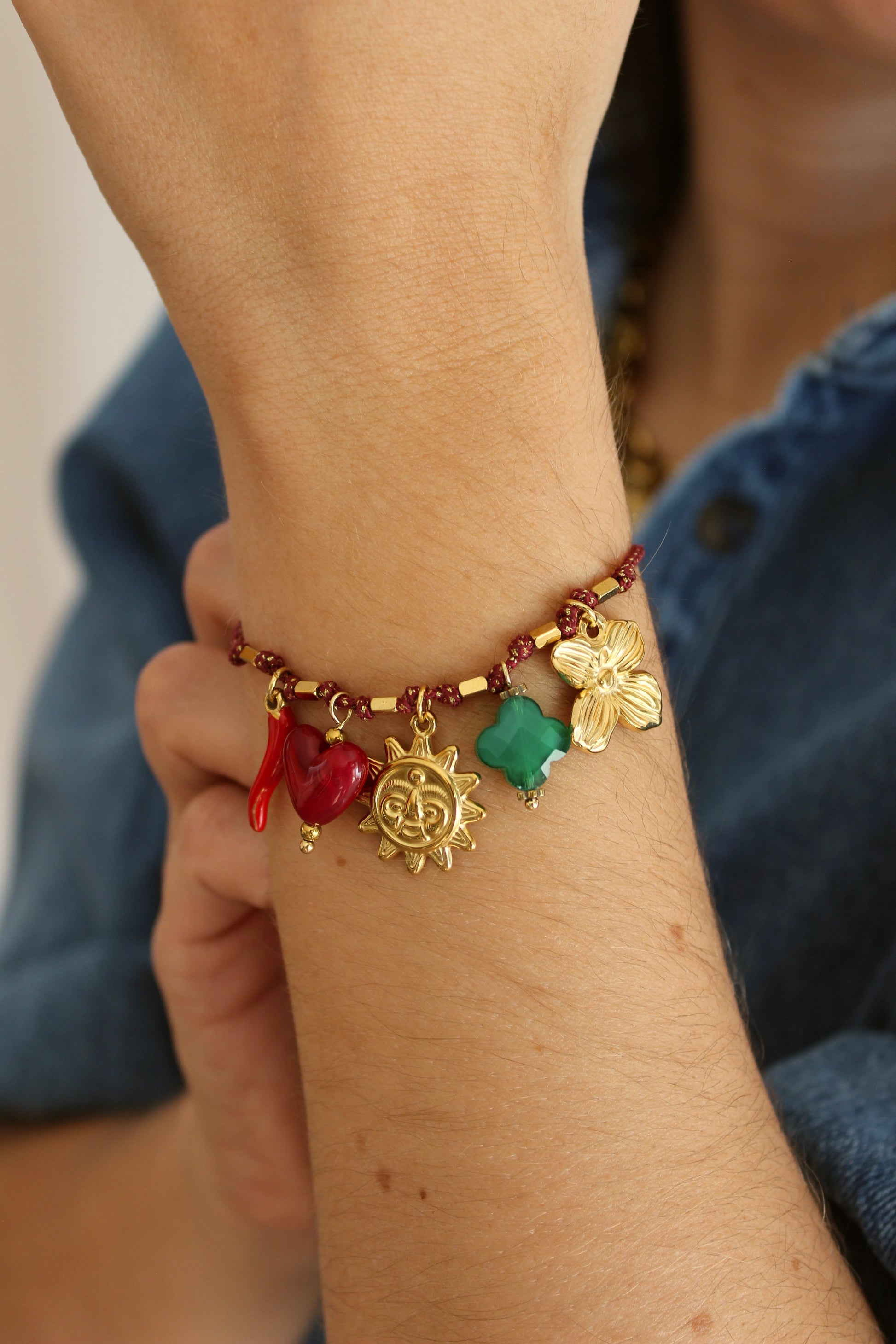 Bracelet doré en cordon rouge et en acier inoxydable résistant à l'eau. Réglable.