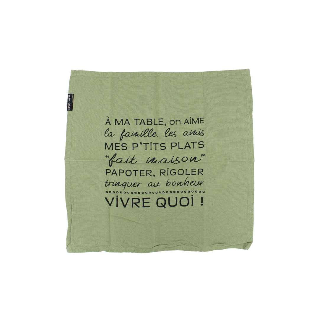 Égayez votre table avec le lot de serviettes Sophie Janière ! Disponible en plusieurs coloris avec des messages personnalisés divers, l’art de la table n’aura plus de secret pour vous. Vous souhaitez offrir un linge de table original ? Laissez-vous charmer par la gamme de torchons et tabliers de cuisine au meilleur prix sur Terres & Beauté.